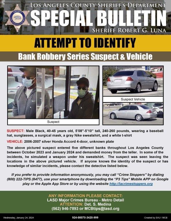 Los Angeles County, CA – The Major Crimes Bureau of the Los Angeles County Sheriff’s Department is seeking the public’s assistance in identifying a male suspect believed to be responsible for a series of bank robberies and attempted bank robberies across Los Angeles County. The incidents occurred between October 2023 and January 2024, with the latest robbery occurring on Monday, January 22, 2024, at the Bank of America in unincorporated Harbor City.