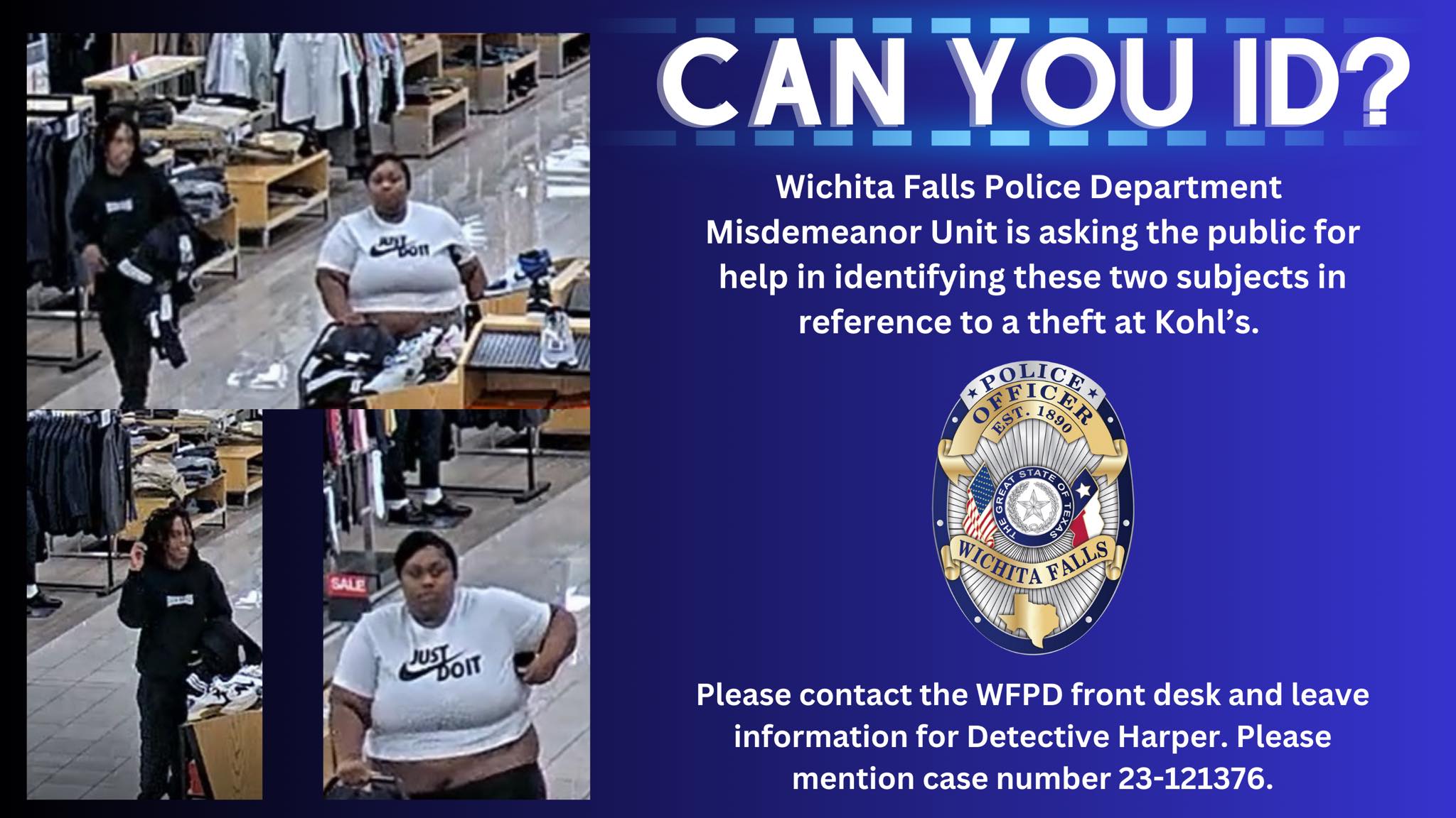 Wichita Falls, TX – The Wichita Falls Police Department Misdemeanor Unit is seeking the public’s assistance in identifying two individuals involved in a theft at Kohl’s.